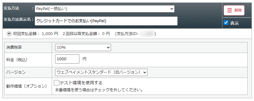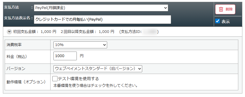 | バージョン | 「ウェブペイメントスタンダード(旧バージョン)」のみ選択できます。 ※「PayPal(月額課金)」は新バージョン「PayPal Checkout」では利用できません。 |