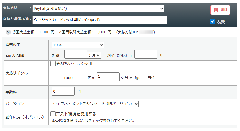 | 手数料 | 初回支払い時にのみ上乗せされる金額を設定できます。 マイナスで金額を指定すると初回支払い時から金額を差し引くこともできます。 参考:定期決済で、初回決済時のみ金額を変更することはできますか? |