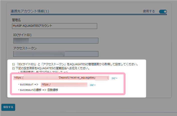5.別途設定が必要なため、「決済連携設定」画面に表示されている設定内容をAQUAGATESの営業担当へお伝えください。
