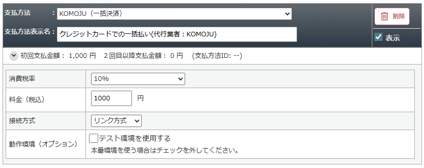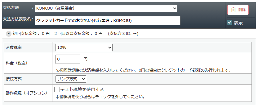支払方法で「KOMOJU(従量定期課金)」を選択して設定します。