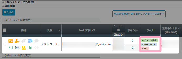 1.登録フォームや個別登録からご自身のメールアドレスをテスト登録し、CSV一括登録でユーザーに付与したいラベルと同じラベルをテストユーザーに付与します。