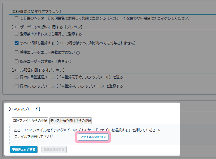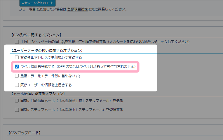 5.ユーザーCSV一括登録画面にて、オプションの「ラベル情報も登録する」にチェックを入れます。