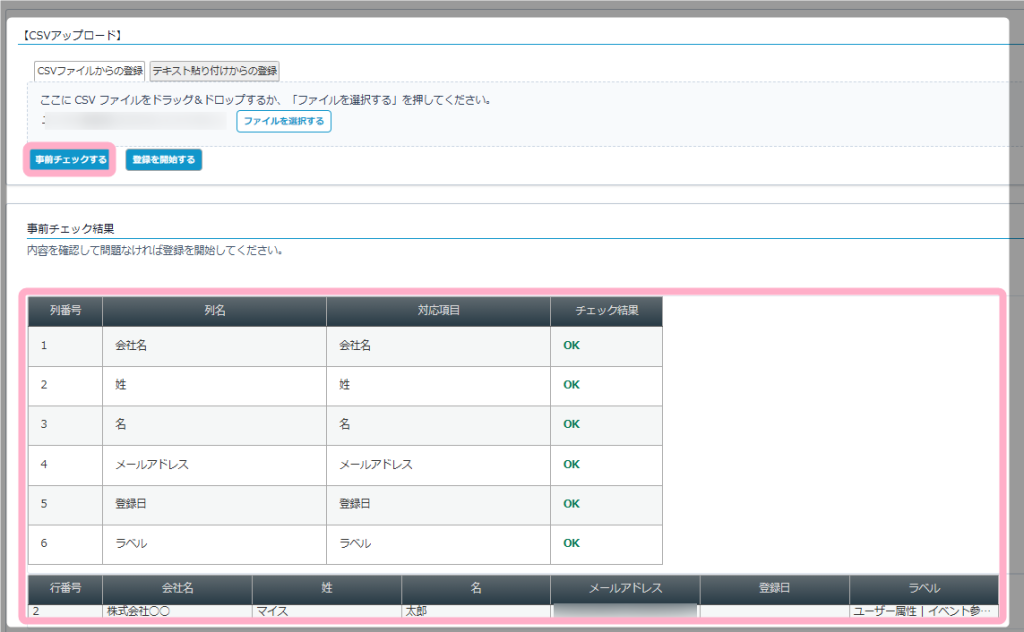 クリックすると、CSVファイルの1行目の項目名を読み取り、ユーザー情報を登録する項目名と照合した結果が表示されます。