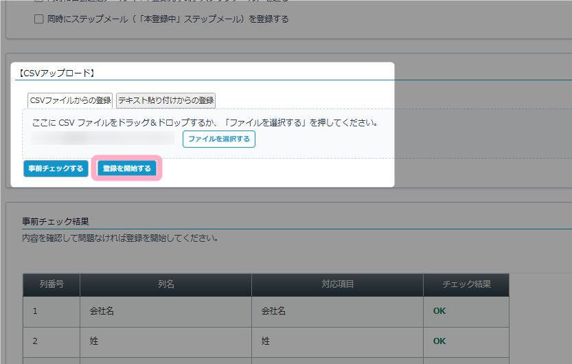 該当列に入力した情報を登録したい場合は、CSVファイルの項目名と「登録項目」の項目名が一致しているか確認してください。