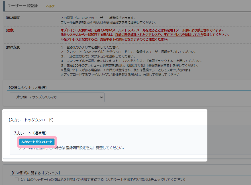 ※その他のオプションの詳細は「画面説明:ユーザーCSV一括登録」を参照してください