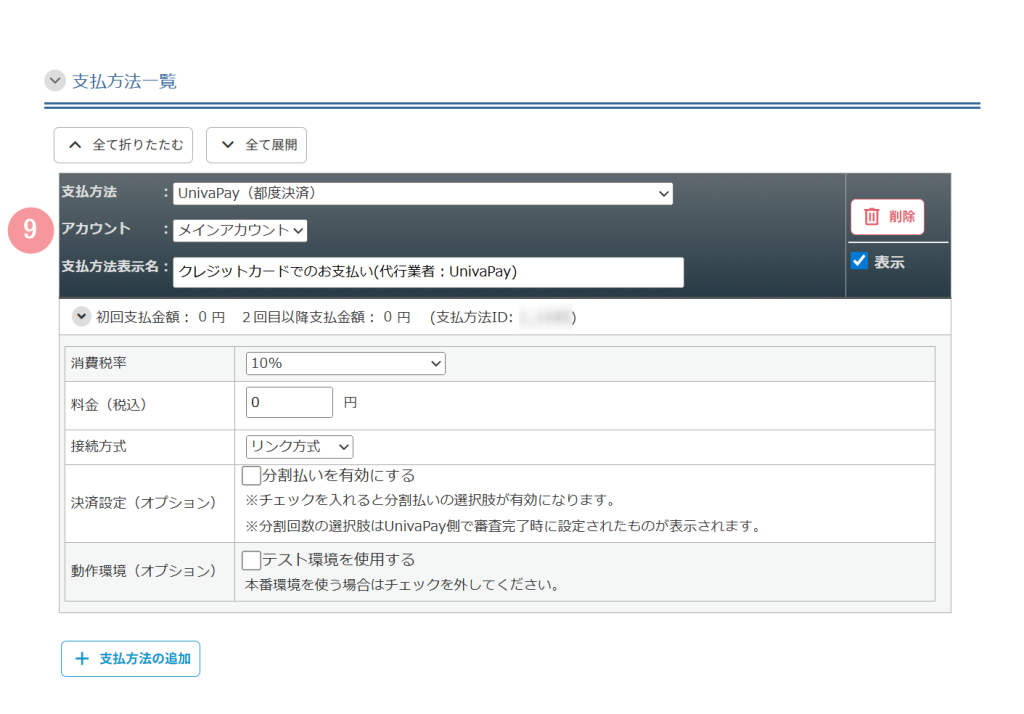 | 9 | アカウント | ※決済代行業者のアカウントを複数連携している場合のみ表示されます。 作成した支払方法に対して、使用する決済代行業者アカウントを切り替えることができます。  |