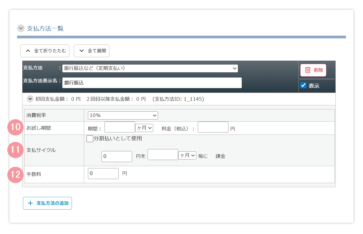 | 12 | 手数料 | ここに設定した金額は、手数料として初回支払い金額に上乗せすることができます。 手数料は、プラスの金額だけではなく、マイナスの金額も設定することができます。 参考:定期決済で、初回決済時のみ金額を変更することはできますか?  |