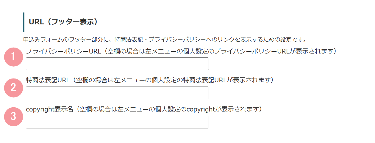 | 2 | プライバシーポリシーURL | 登録フォームのフッター(下部)に表示されるプライバシーポリシーの遷移先URLを設定することができます。 空欄の場合は「個人設定」で設定したプライバシーポリシーURLが遷移先になります。 参考:プライバシーポリシーと特定商取引法に基づく表記(特商法表記)の書き方  |