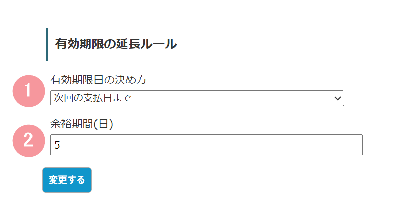| 1 | 有効期限日の決め方 | 受領処理した際に、次回支払日を起点としていつまで有効期限を延長するかを設定します。 参考:機能解説:ユーザーの有効期限  |