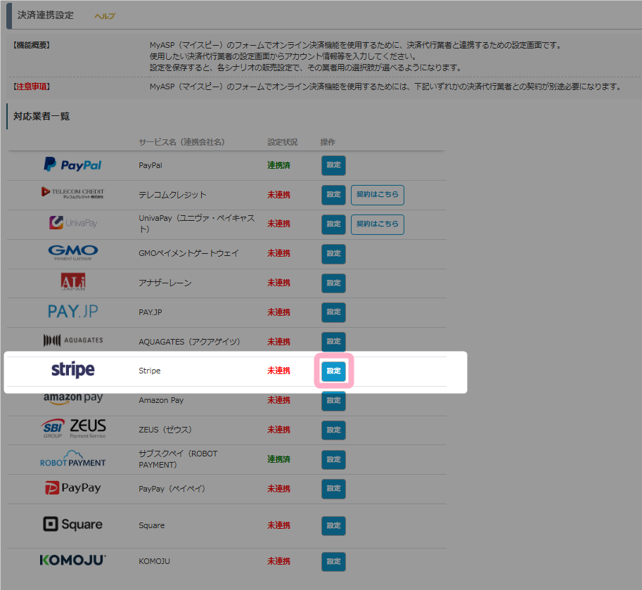 6.「決済連携設定」画面の対応業者一覧から、Stripeの「設定」をクリックします。