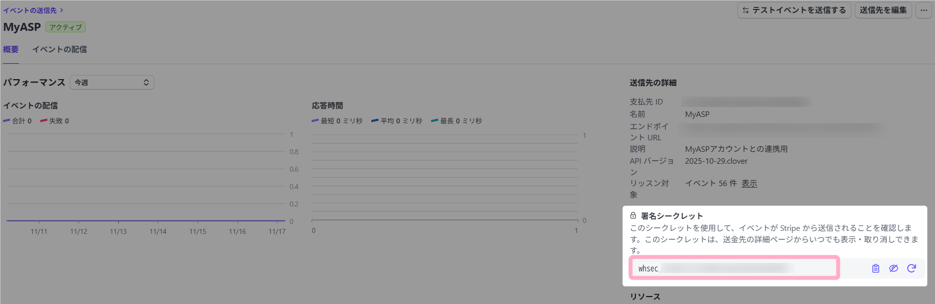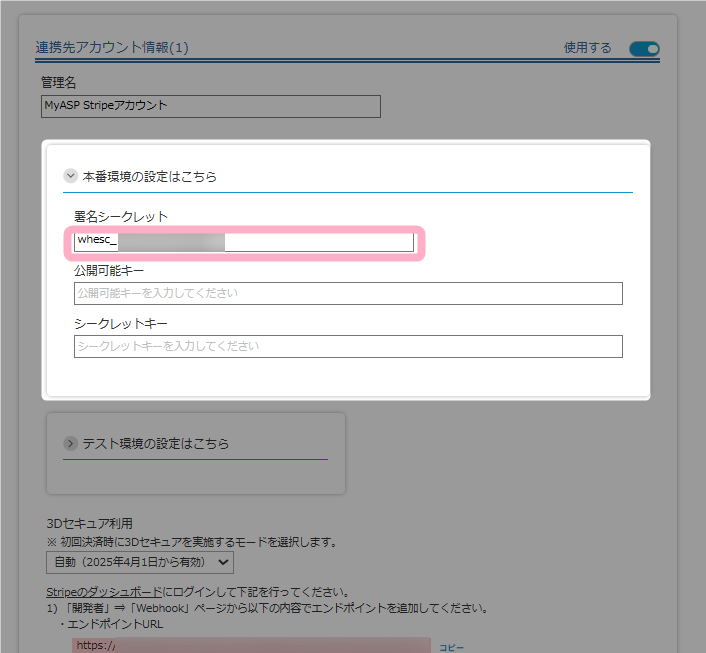 17.コピーした署名シークレットを、MyASPの「決済連携設定」画面に入力します。