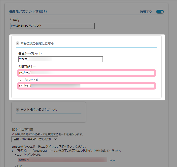 19.コピーした「公開可能キー」と「シークレットキー」をMyASPの「決済連携設定」画面に入力します。