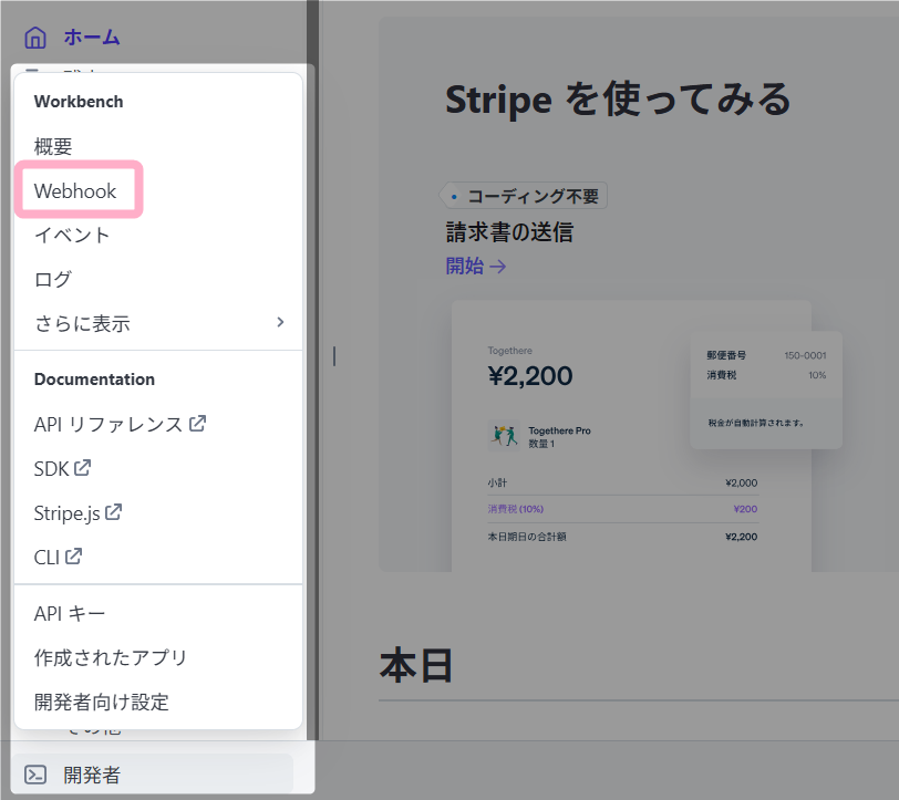 8.Stripeのダッシュボードにログインし、「開発者」をクリックします。