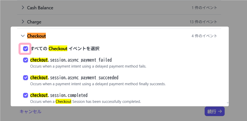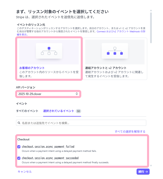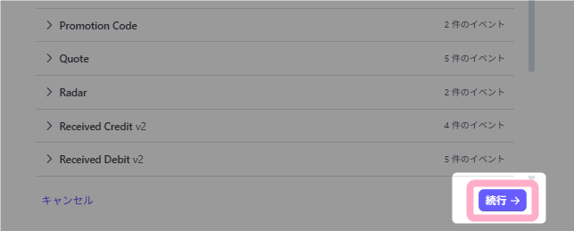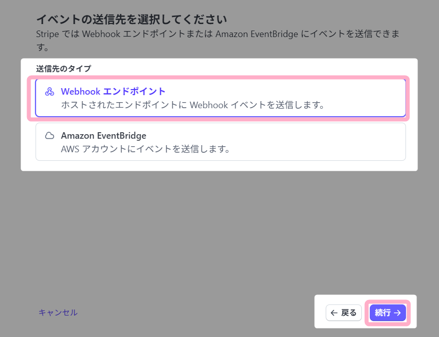 13.イベントの送信先について、「Webhookエンドポイント」を選択し「続行」をクリックします。