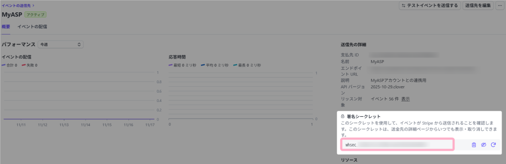 送信先の詳細にある「署名シークレット」の『』をクリックし、表示された署名シークレット値をコピーします。