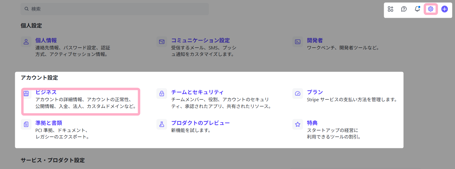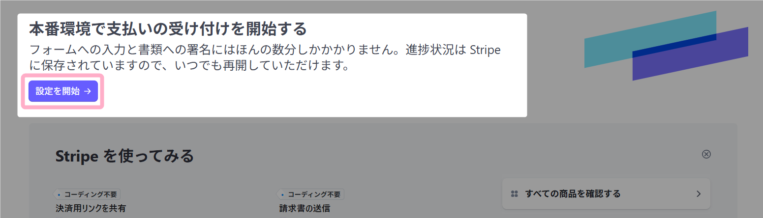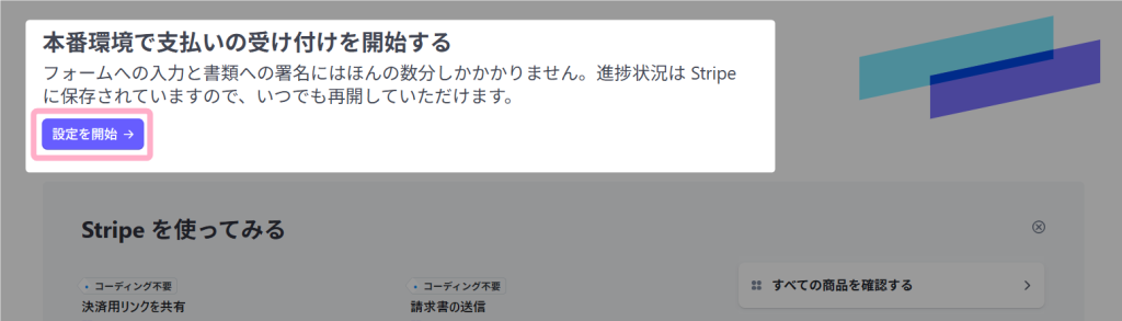 1.Stripeのダッシュボードの下記のどちらかの画面から本番環境利用の設定を行います。