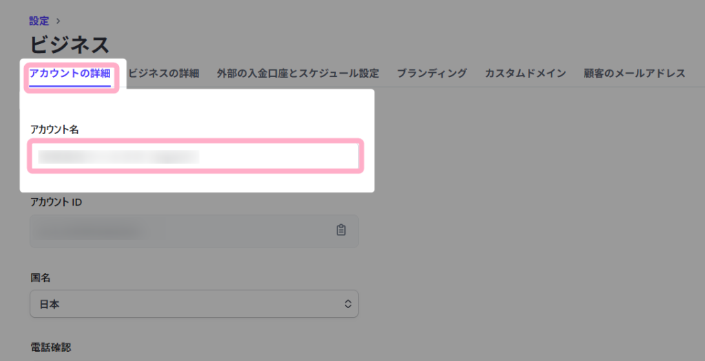 の「アカウントの詳細」タブにある「アカウント名」を入力します。
