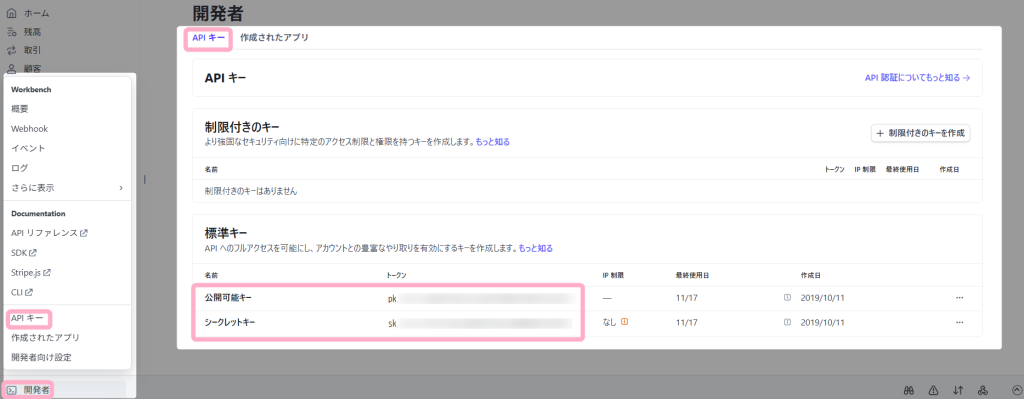 「開発者」 > APIキー をクリックすると「公開可能キー」と「シークレットキー」を確認できます。