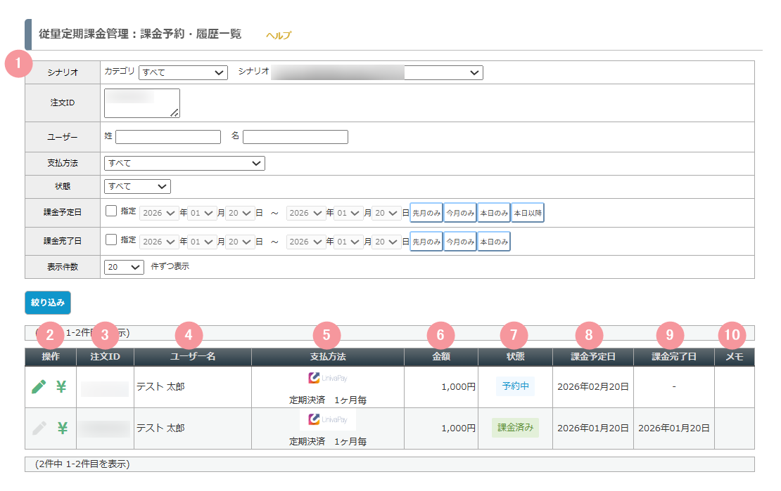 | 1 | 検索パネル | シナリオや注文ID、支払方法などからユーザーを絞り込むことができます。 |