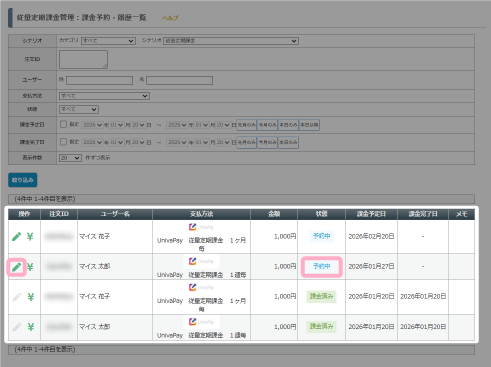 「従量定期課金管理:課金予約・履歴一覧」画面では、従量定期課金を利用したユーザーの課金履歴や予約状況を確認・編集することができます。