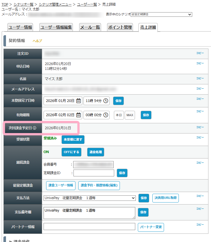 「課金日」を変更すると、次回以降の課金完了時に算出される「課金予定日」の日付が「課金日」の日付になります。