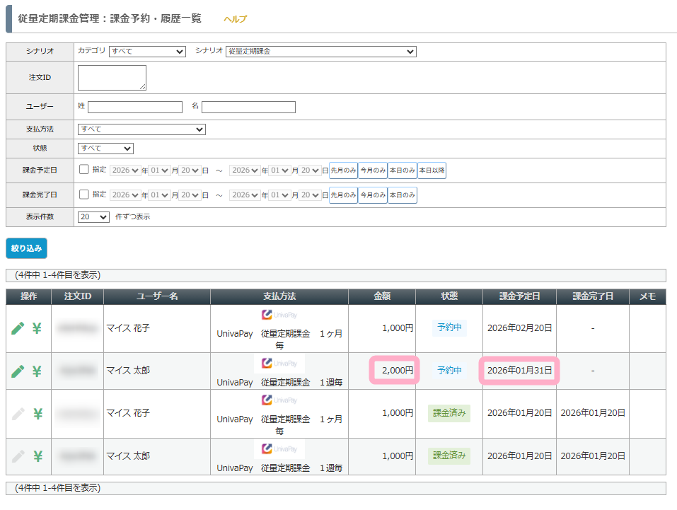2)「課金予約編集」画面にて、課金予定日や金額を書き換えると「課金予約一覧」に反映され、次回課金予定日や金額を変更することができます。