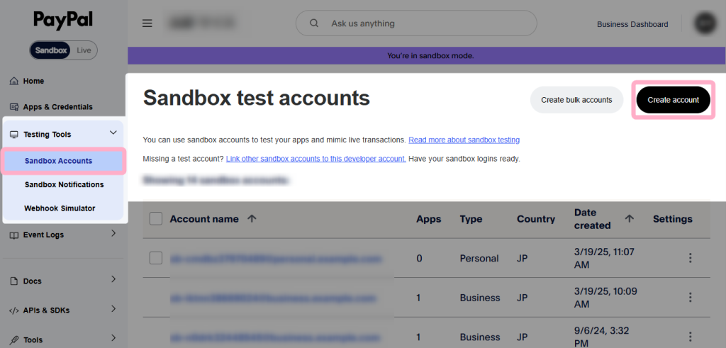 Sandbox環境でプランIDを作成する場合は、Paypal Developerのダッシュボードから、Testing Tools > Sandbox accounts を開きます。