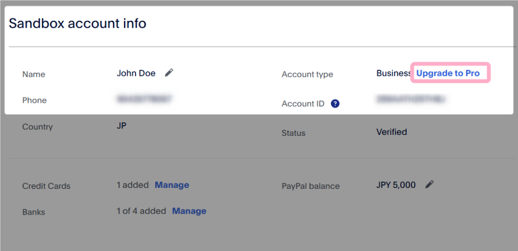 2.アカウント詳細画面内「Sandbox account info」にある「Upgrade to Pro」をクリックします。