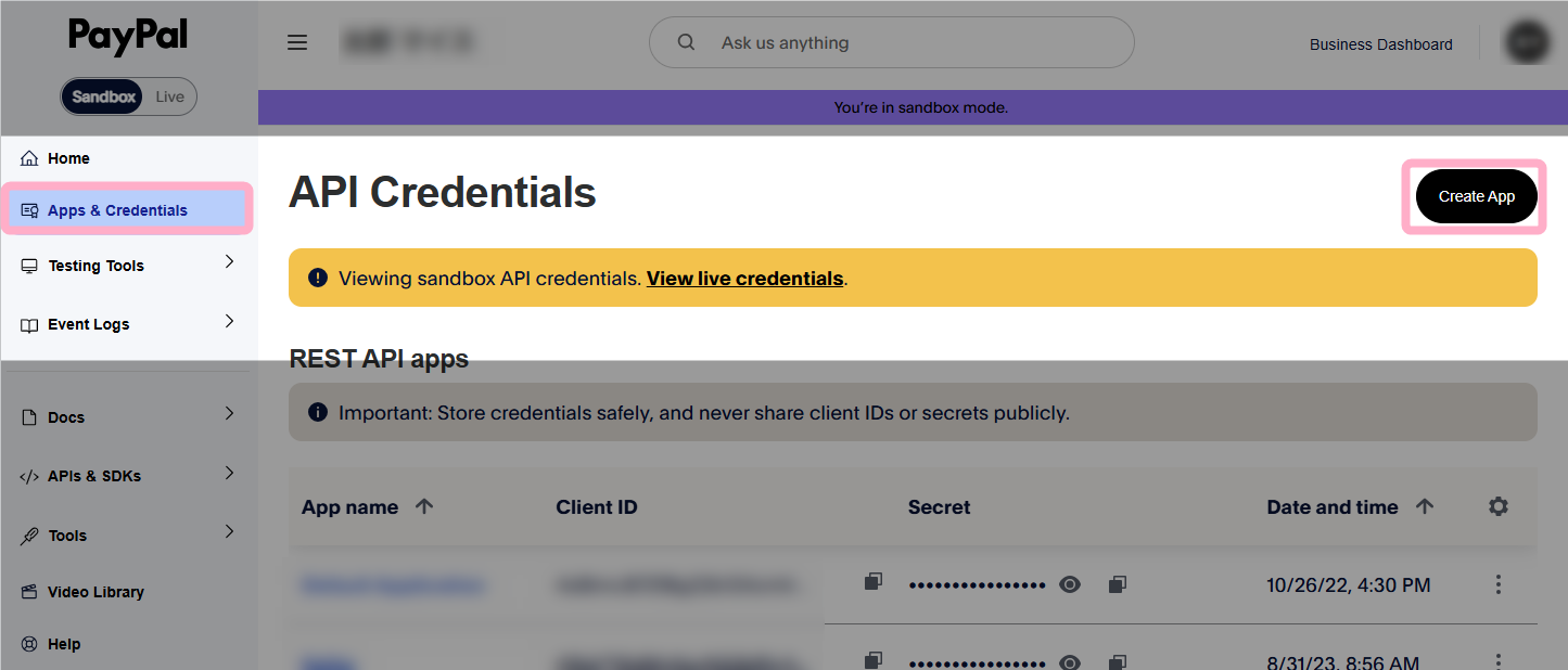 1.再びPayPal Developer Dashboardに戻り、「Apps & Credentials」の「Create App」をクリックします。