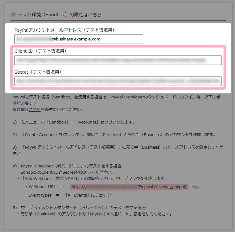 - 「決済連携設定」画面でSandboxアカウントの連携設定を行う
