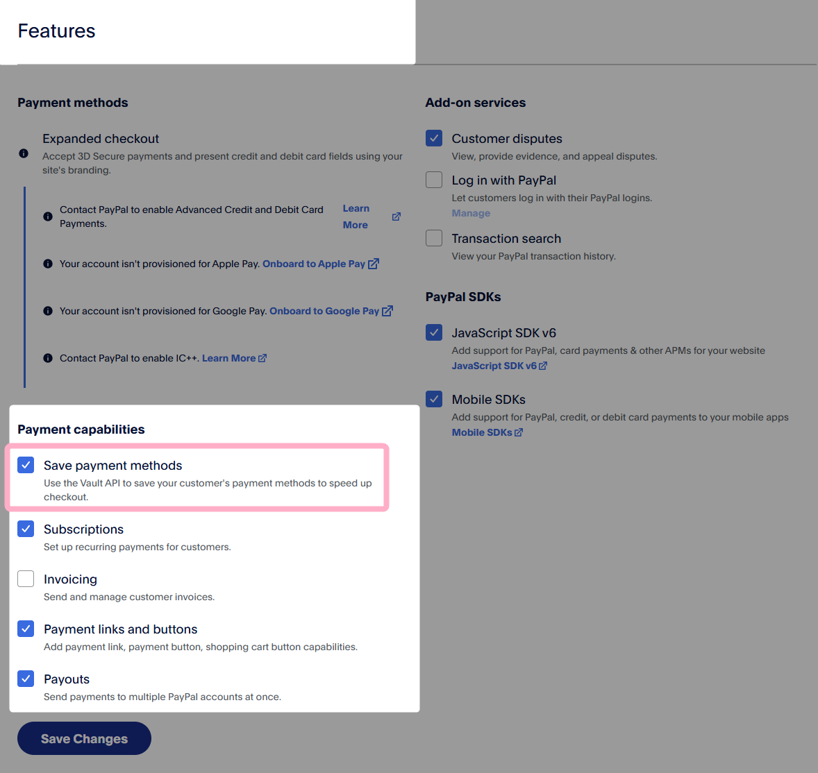 3.Appが作成されたら、App詳細画面内にある「Features」の『Save payment methods』にチェックを入れて『Save Changes』をクリックして設定を保存します。