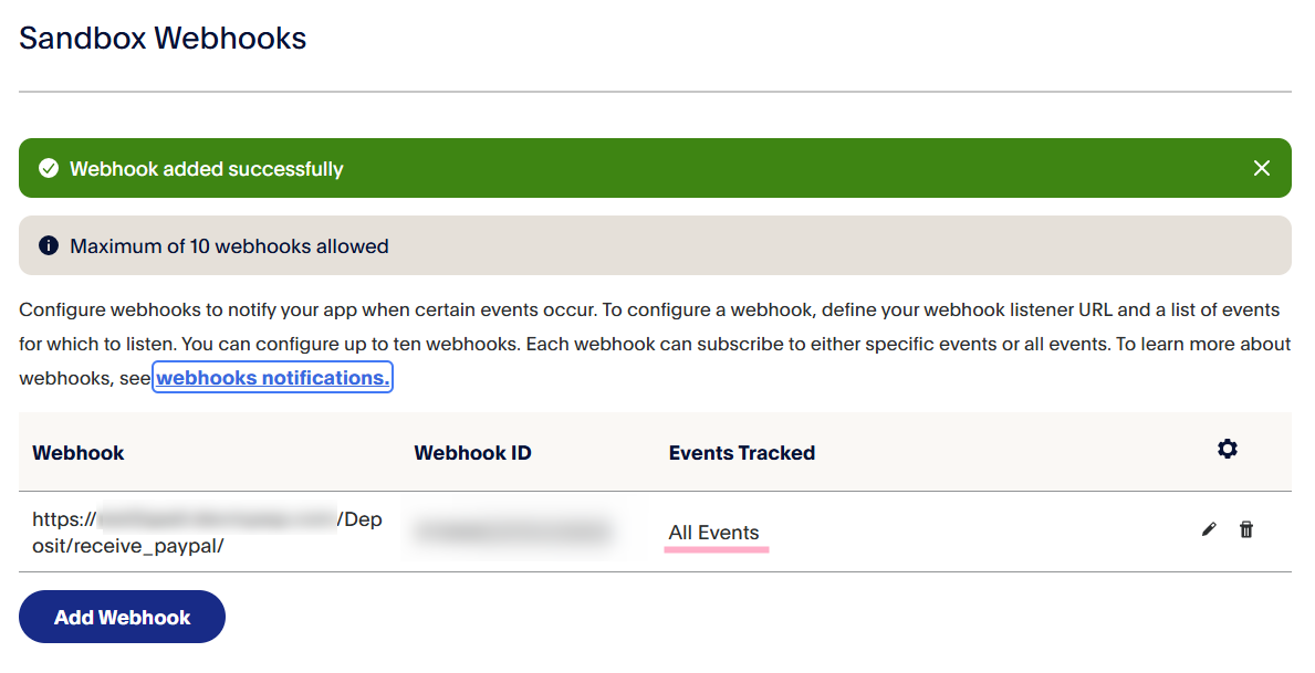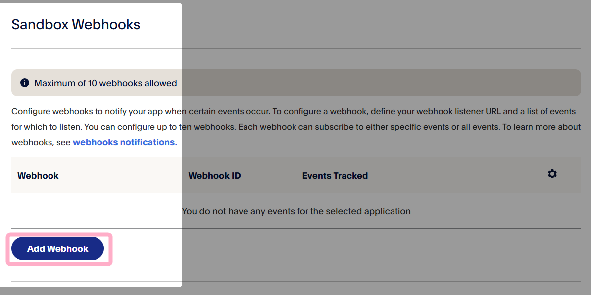 2.「テスト環境用APIキーの用意」で作成したAppの詳細(Edit)画面を開き、Sandbox Webhooksの『Add Webhook』をクリックします。