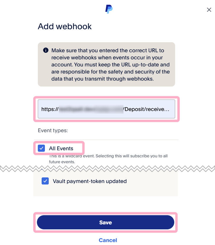3.Webhook URLに手順1.でコピーしたURLを入力し、All Eventsにチェックを入れ、最下部の『Save』をクリックします。