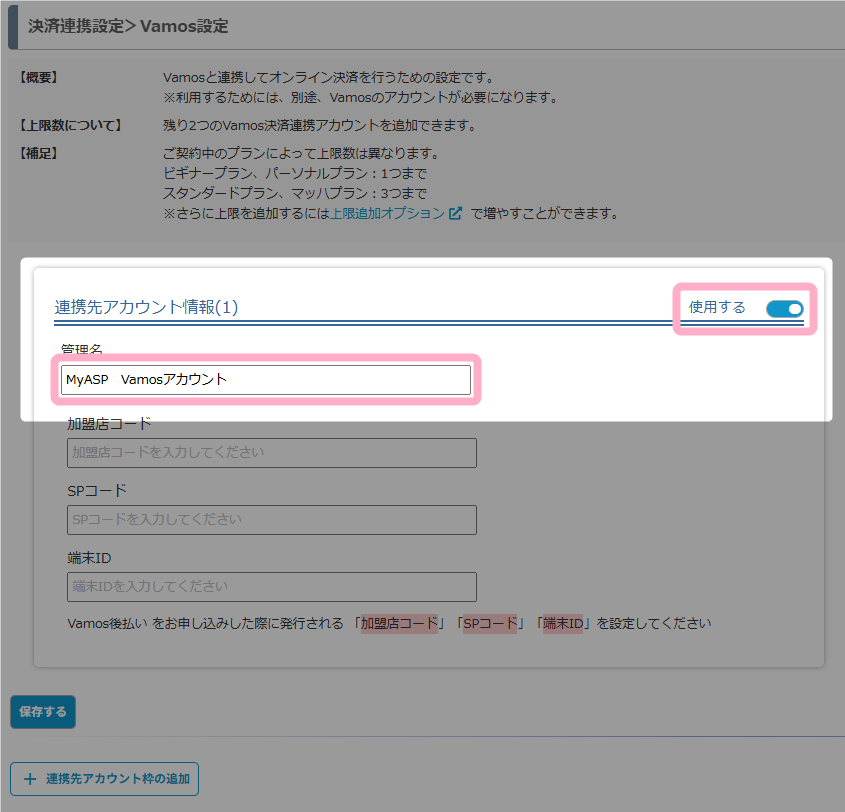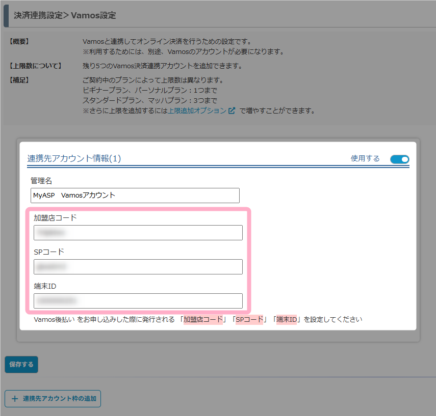 入力するコード、IDは、バモス後払い契約時に発行された「加盟店コード」「SPコード」「端末ID」の情報を設定してください。