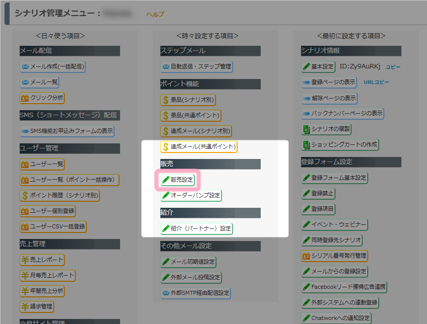 シナリオ管理メニュー > 販売設定