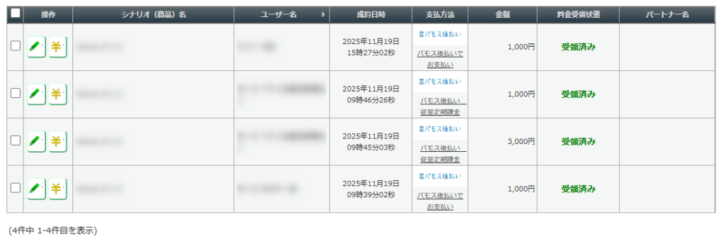 バモス後払いの与信審査が正常に完了すると、料金受領状態が「受領済み」に変わります。