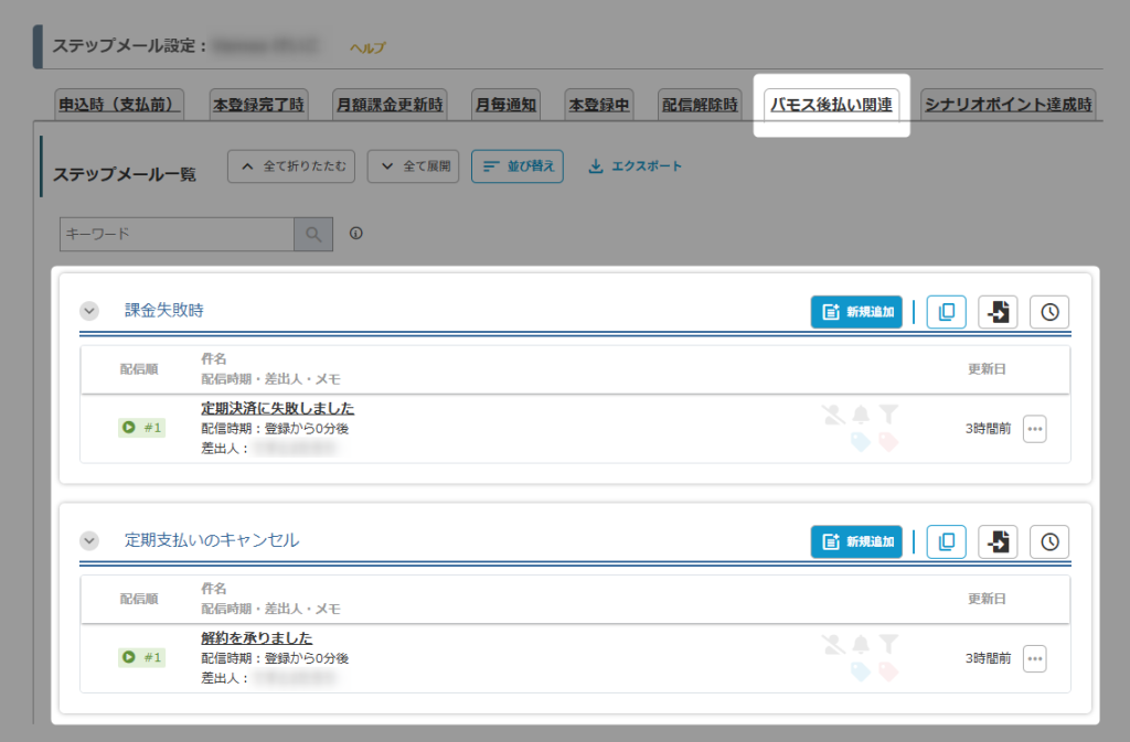 | 課金失敗時 | 決済代行業者(バモス後払い)側からの与信審査の結果が「NG」となった場合に配信されるステップメールを設定できます。 |