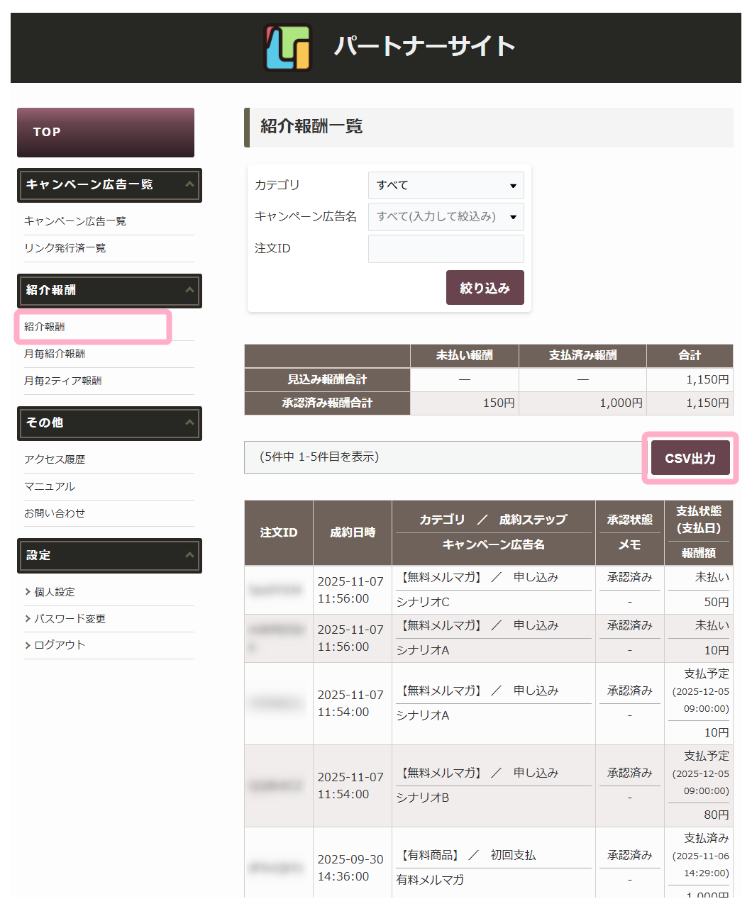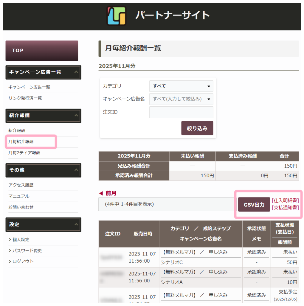 「CSV出力」ボタンをクリックすることで、紹介報酬の一覧をCSV出力することができます。