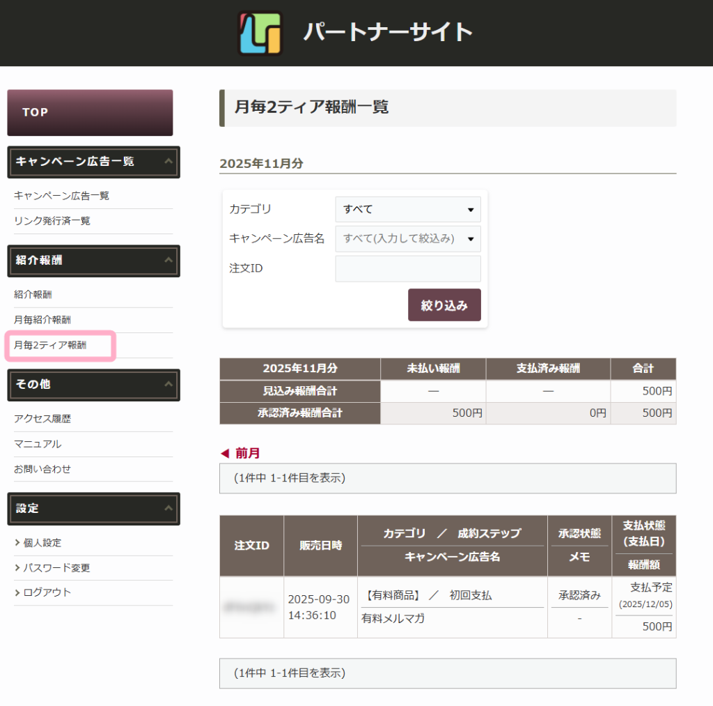 月毎紹介報酬画面では、該当パートナーの2ティア報酬一覧と、2ティア報酬の合計が月毎に表示されます。