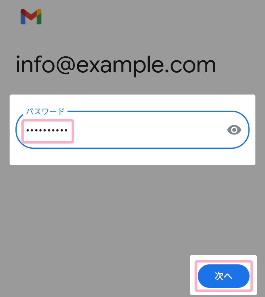 メールに記載の「メールアカウント」を確認し、該当メールアドレスのパスワードを入力して「次へ」をタップします。