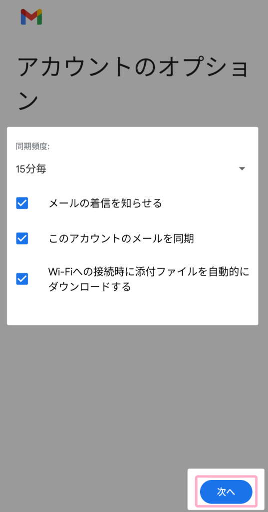 | このアカウントのメールを同期 | チェックを入れると、Gmailアプリで設定したメールアドレスを同期できます。 |