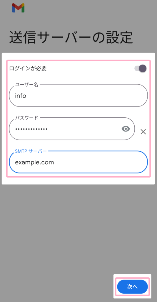 | サーバー | 「■メールサーバー情報」欄に記載されているSMTPサーバー | example.com |