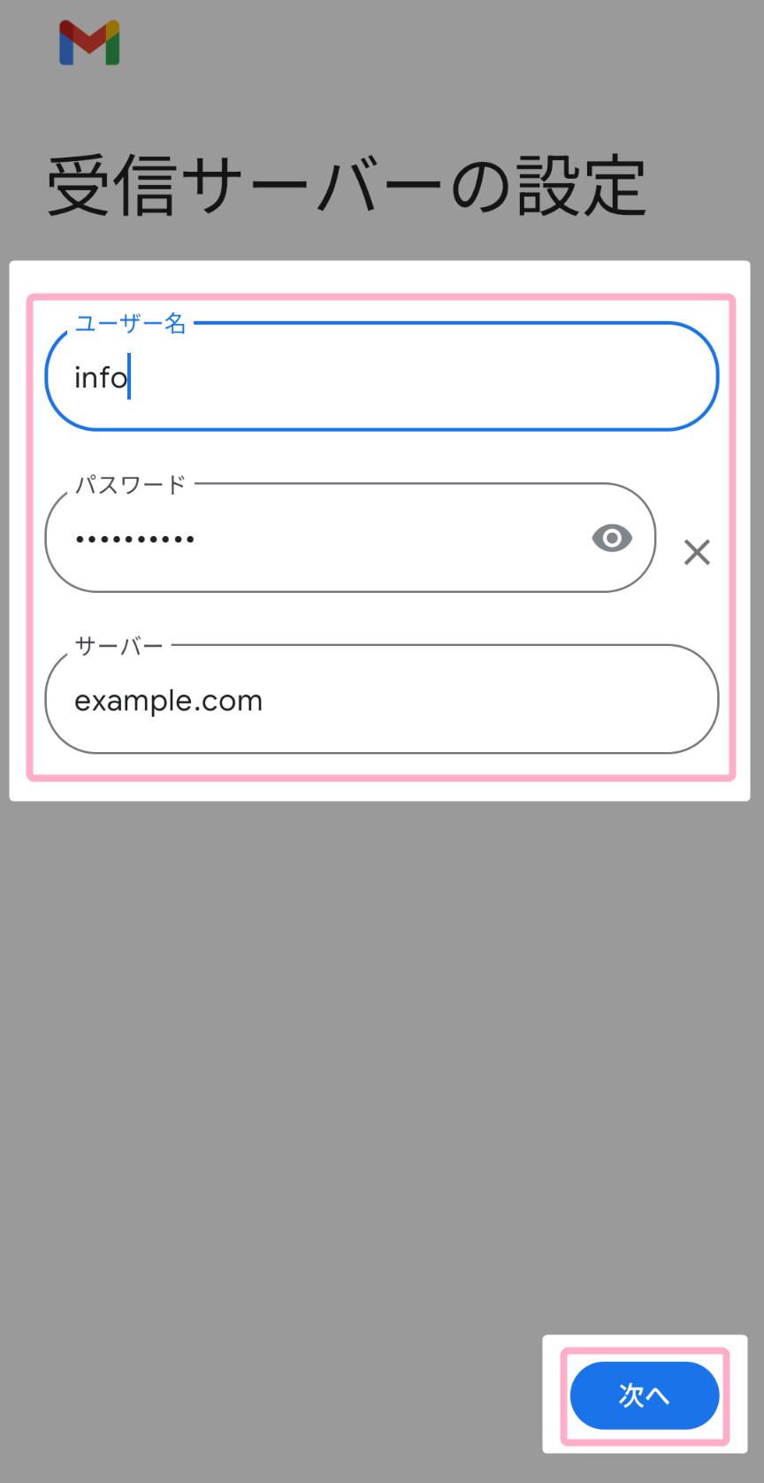 | サーバー | 「■メールサーバー情報」欄に記載されているIMAP/POPサーバー | example.com |