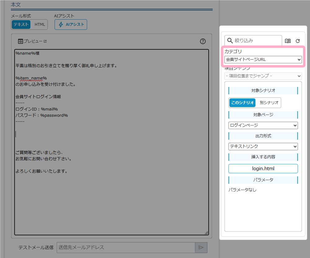 1.置き換え文字メニューのカテゴリにて、「会員サイトページURL」を選択します。