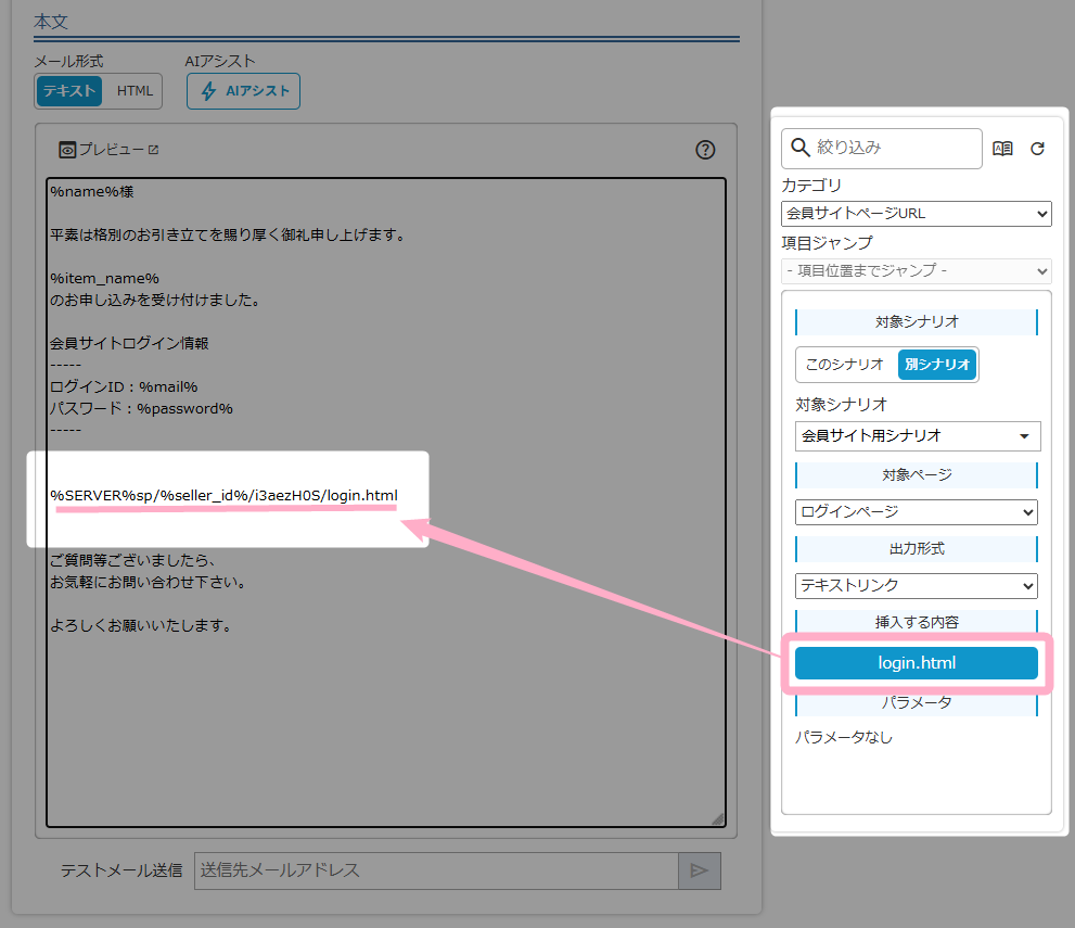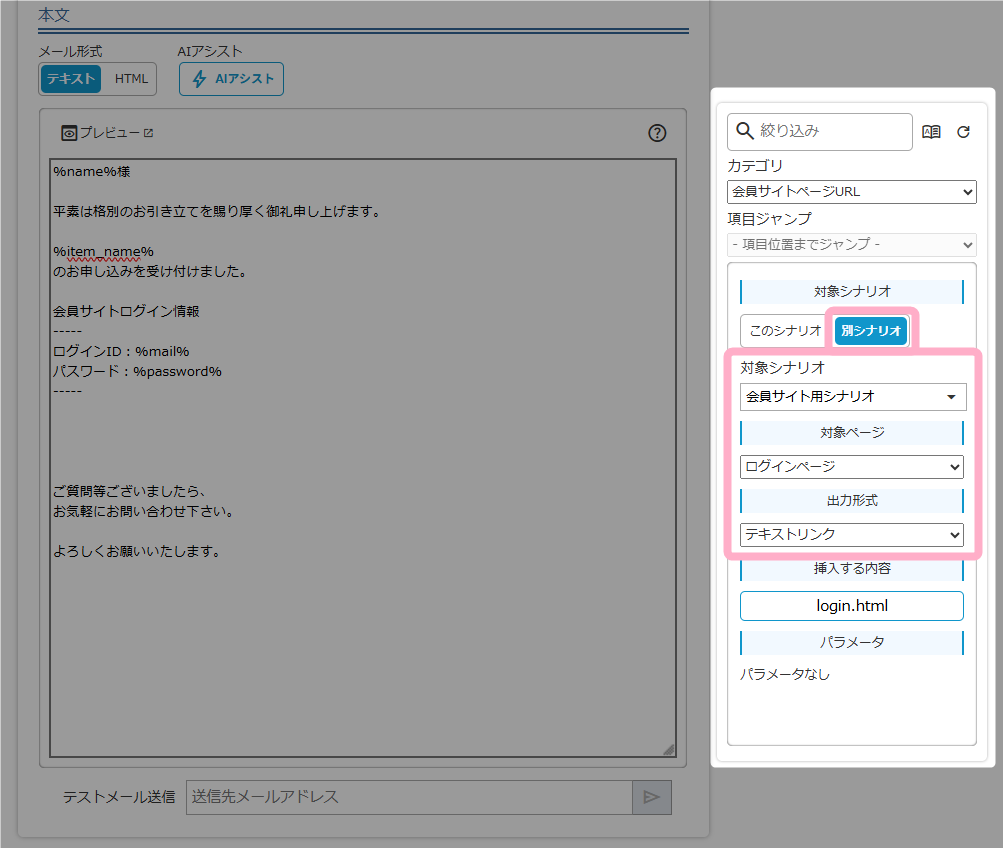 また、別シナリオの会員サイト情報も同様に置き換え文字で挿入できるため、複数のシナリオをまたいだ会員サイトの運用が簡単に行えます。