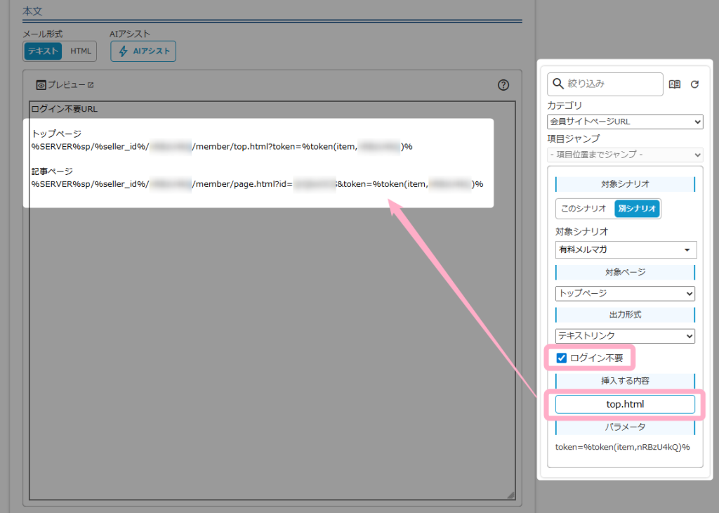 ログイン不要のURLを案内することで、別シナリオの会員サイトであってもユーザーにログインの手間を強いることなく、特定のページへダイレクトにアクセスさせる運用ができます。