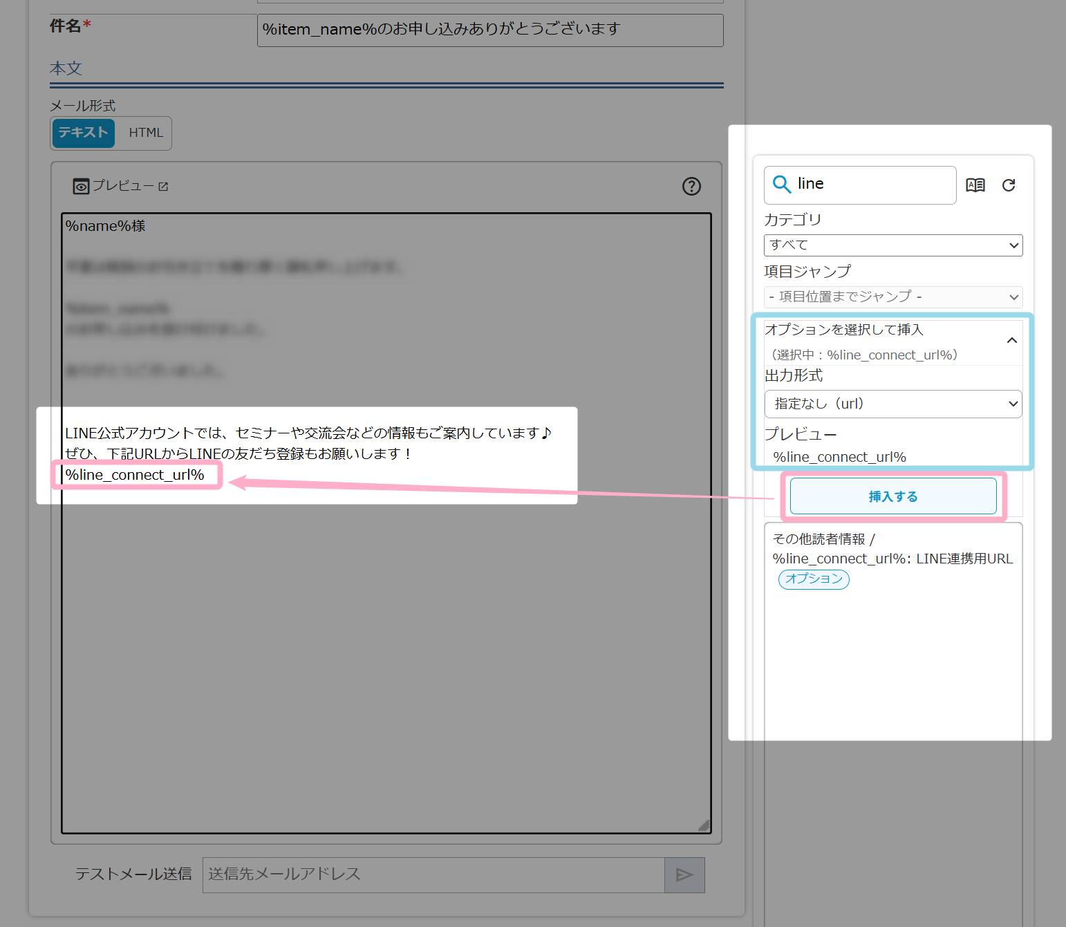 3.本文右側の置き換え文字挿入パネルから「%line_connect_url%: LINE連携用URL」を挿入します。