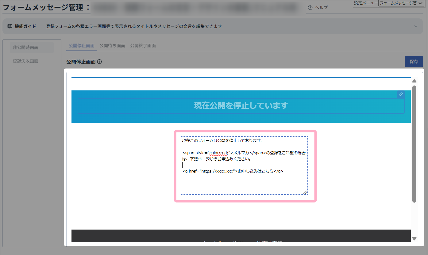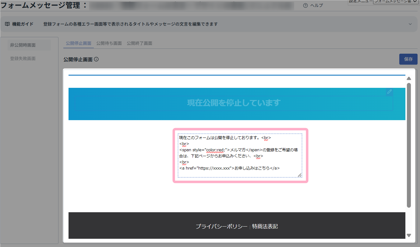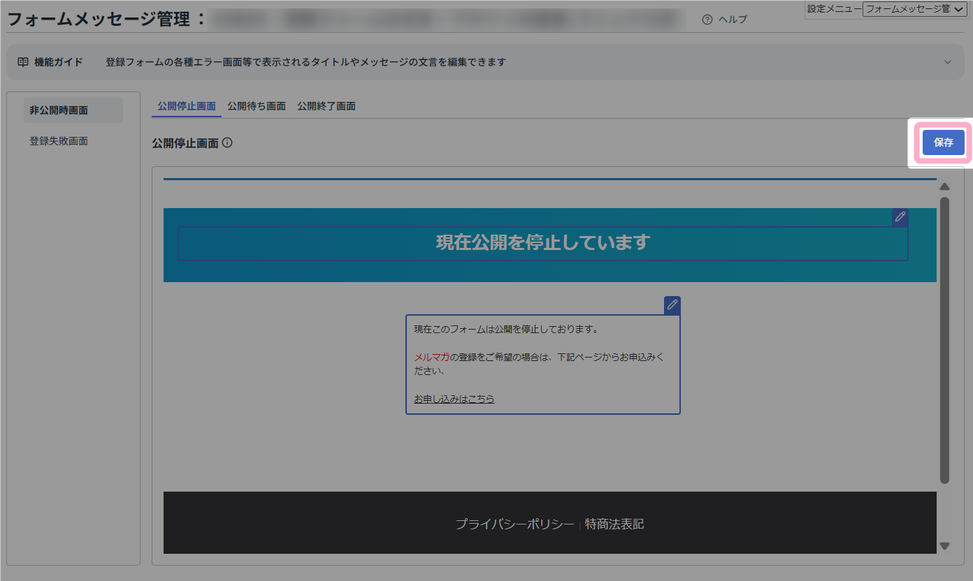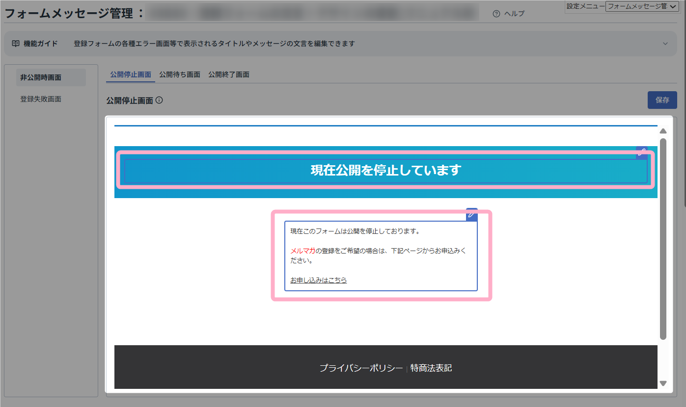 本マニュアルでは、登録フォームを非公開に設定している際に表示される「公開停止中」画面を編集する方法を例に説明します。