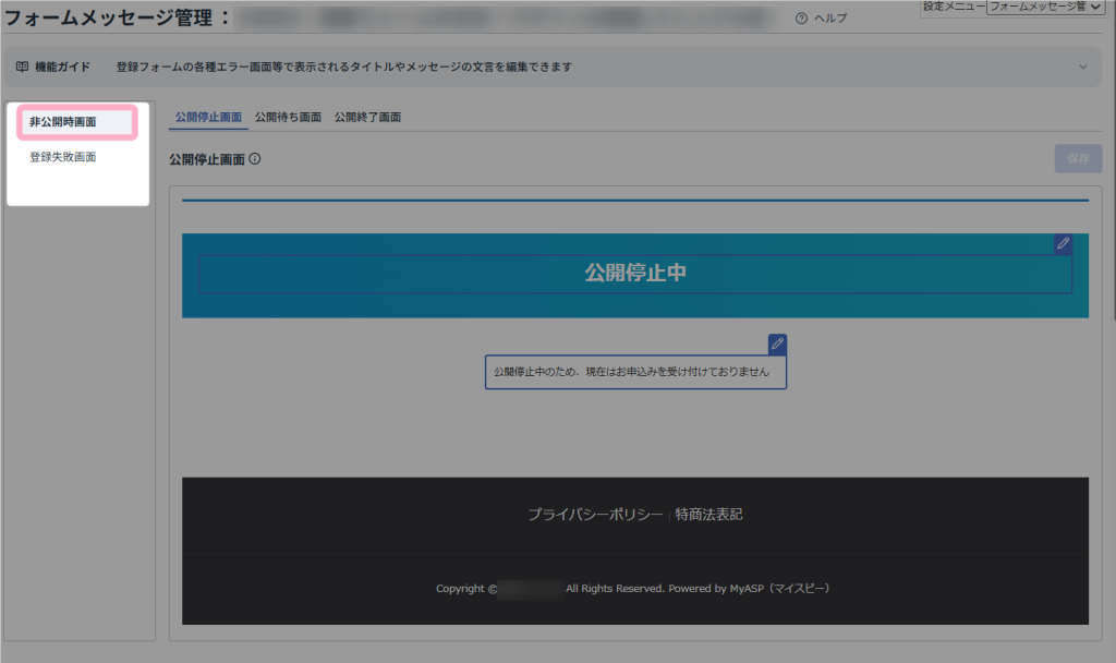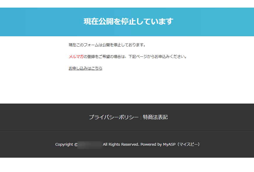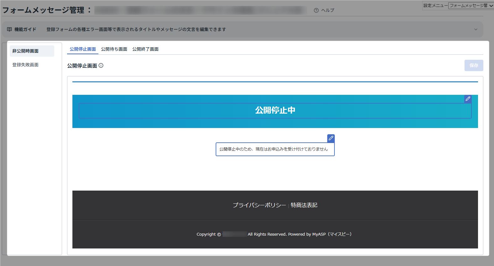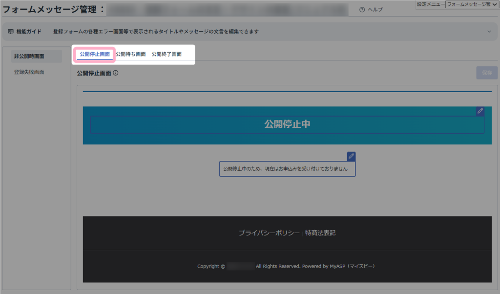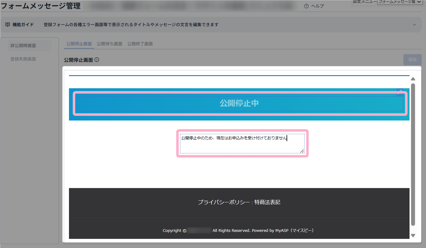 本マニュアルでは、登録フォームを非公開に設定している際に表示される「公開停止中」画面を編集する方法を例に説明します。