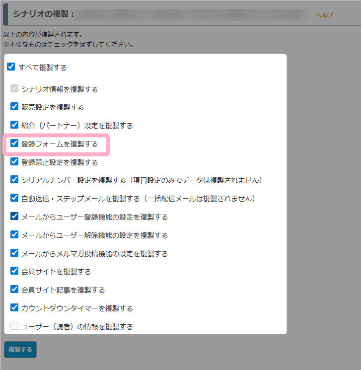 にて、「登録フォームを複製する」にチェックを入れたうえでシナリオを複製(新規作成)してください。
